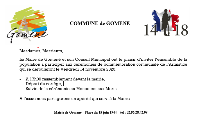 Le Maire de Gomené et son Conseil Municipal ont le plaisir d’inviter l’ensemble de la population à participer aux cérémonies de commémoration communale de l’Armistice qui se dérouleront le Vendredi 14 novembre 2025.